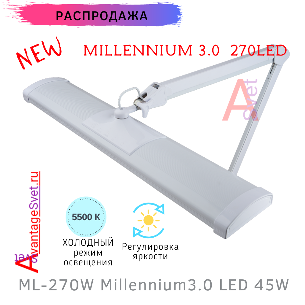 ML-270W (белая) Millennium 3.0 270LED Оригинал. Бестеневая настольная светодиодная лампа ( 45W 270LED, холодный свет 5500К, регулировка яркости 5 уровней, струбцина 65мм, длина плафона 67см.)8970.00 руб.